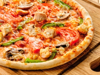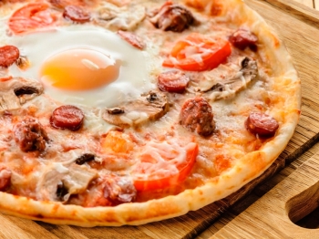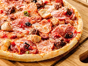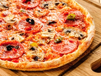 колбаски охотничьи, перец болгарский, ветчина, маслины, помидор, моцарелла, соус фирменный