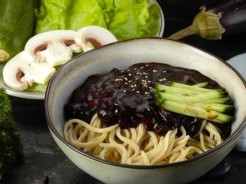 лапша пшеничная, свинина, соус из бобов, огурец, яйцо перепелиное, лук зеленый, кунжут