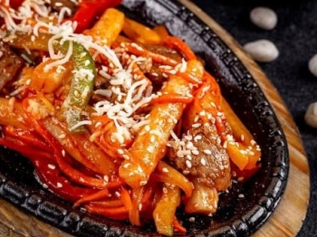 курица, рис, яйцо жареное, нори, кунжут, бульон, соус сладко-острый, микс корейских салатов