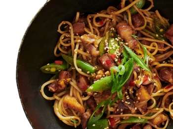 лапша яичная, курица, соус острый, кунжут, лук, перец болгарский