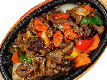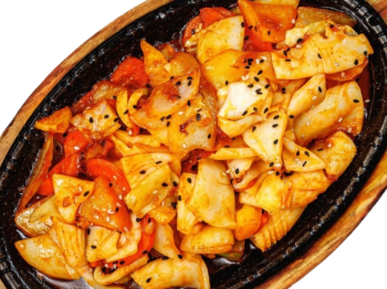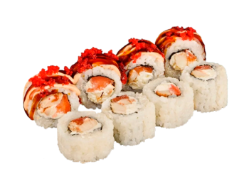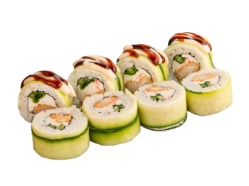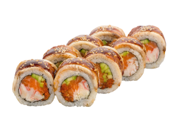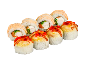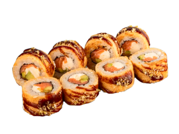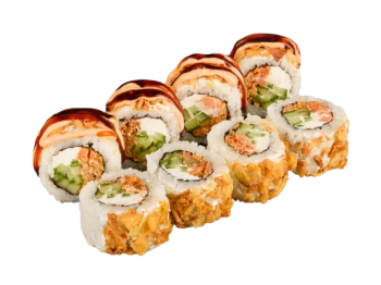 рис, лосось, соус терияки, сыр сливочный, огурец, соус унаги, лук фри, соус имбирный