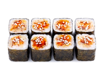 рис, нори, угорь, сыр сливочный, огурец, икра масаго, соус карри