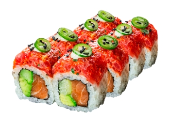 рис, нори, лосось, авокадо, тунец, перец халапенью, соус сырный