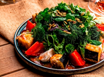 баклажаны, томаты, сыр фета, салат, зелень, заправка фирменная, семечки