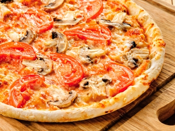 колбаски охотничьи, перец болгарский, ветчина, маслины, помидор, моцарелла, соус фирменный