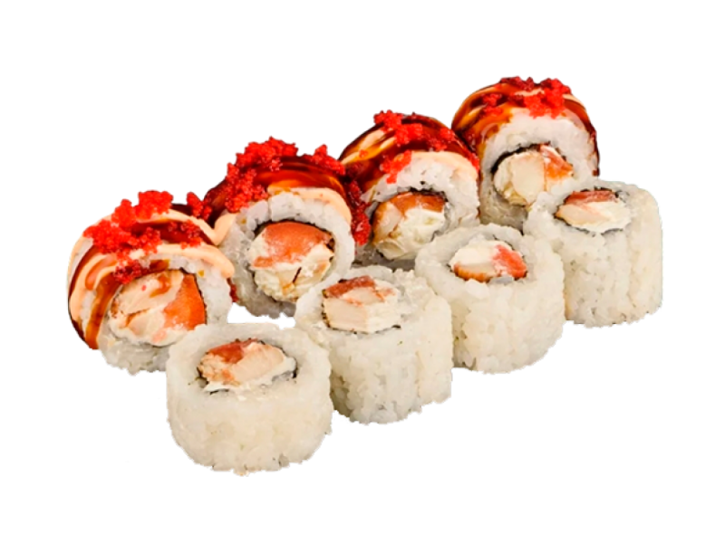 рис, курица, помидор, сыр сливочный, икра масаго, соус унаги, соус имбирный