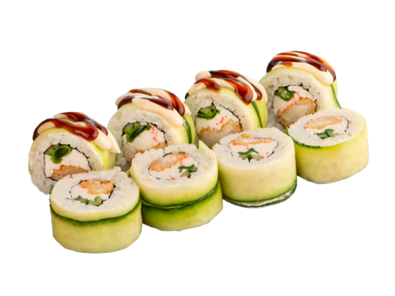 рис, креветки, краб снежный, огурец, соус унаги, сыр сливочный, соус имбирный