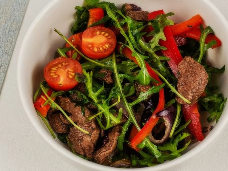 печень куриная, черри, салат, орехи кедровые, пармезан, бекон, заправка фирменная, лук красный